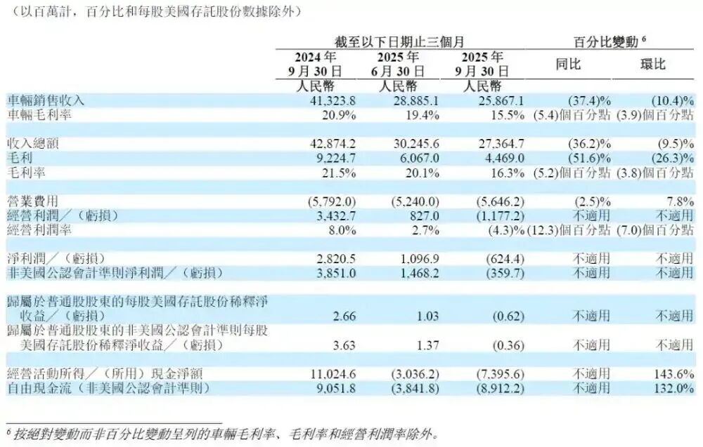 理想强行套上职业经理人的“标准化西装”,并未带来预期的优雅与稳健,此次第三季度财报就是一个说明。2025年Q3财报数据显示,理想累计交付新车9.21万台,同比减少39.0%。受交付量下滑影响,期内,其总收入同比下滑36.2%至273.65亿元,毛利率同比下滑5.2个百分点至16.3%,净亏6.24亿元。