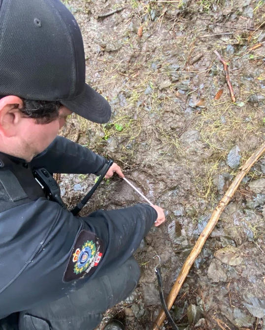 工作人员在测量灰熊留下的脚印