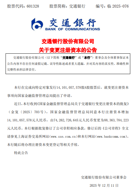 12月11日金融一线消息括普投资,交通银行今日发布关于变更注册资本的公告。公告指出,近日,该行收到《国家金融监督管理总局关于交通银行变更注册资本的批复》(金复〔2025〕703号),国家金融监督管理总局同意该行注册资本增加14101057578元人民币,由74262726645元人民币变更为88363784223元人民币。